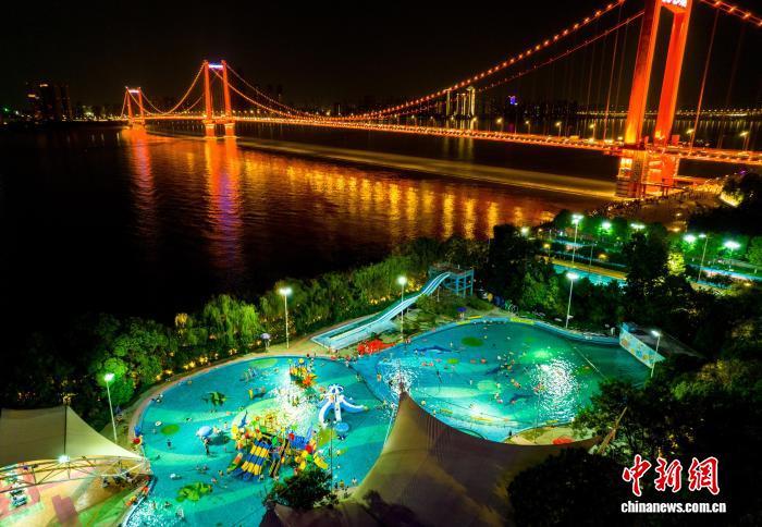 湖北省武漢市の鸚鵡洲長江大橋のたもとにある漢陽江灘水上楽園(ウォーターパーク)は8月4日夜、青々と茂る木々に囲まれていた。園内には、各種遊具が揃っており、子連れの市民は、水遊びを楽しみ、暑い夏の日に涼しさを満喫していた。中国新聞網が伝えた。