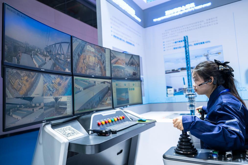 10月31日、2025国際(武漢)スマート建設産業博覧会で、タワークレーンのスマート集中制御システムを実演するスタッフ。