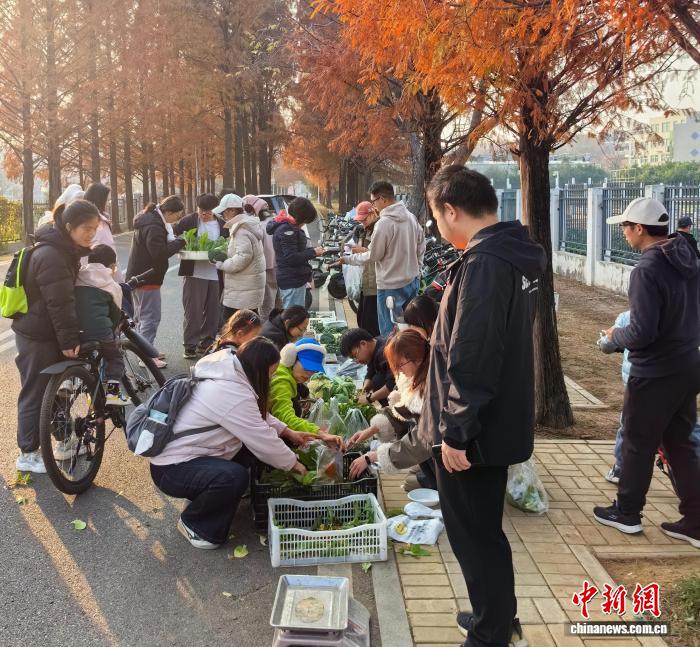 湖北省武漢市にある華中農業大学園芸林学学院実践教育拠点の校門前で6日、収穫されたばかりの新鮮な野菜が入ったかごがずらりと並べられ、多くの人が購入していた。中国新聞網が伝えた。