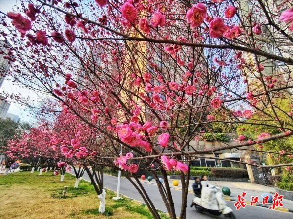 1月14日朝、武昌の融侨華府(ロンチャオフーフ)コミュニティで、数々の紅梅が朝日に照らされ咲き誇り、早起きした住民たちが花の間をそぞろ歩いていた。