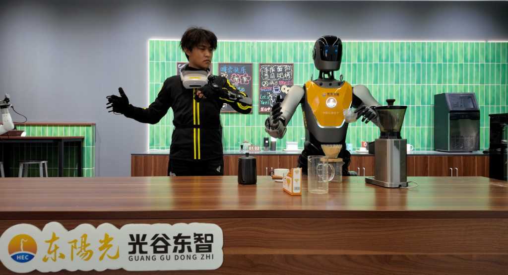3日、湖北人型ロボットイノベーションセンターで、ロボットにコーヒーの入れ方を学習させるロボットトレーナー。